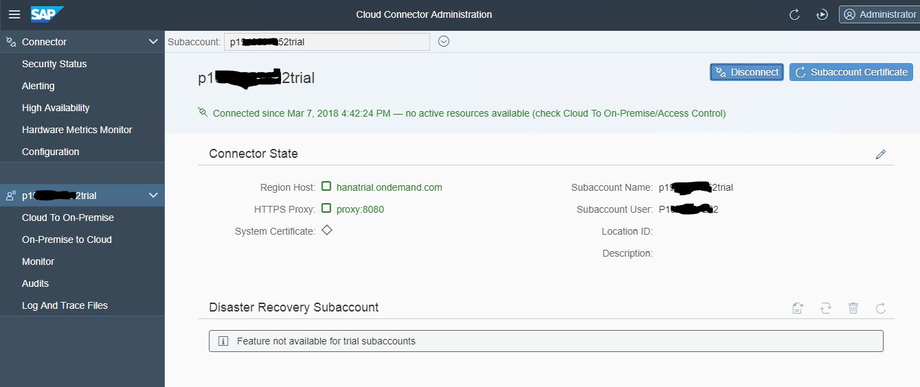 This indicates that we have successfully connected the SAP HANA Cloud Platform with the Cloud Connector.